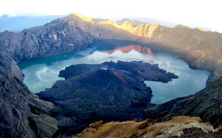 La caldera d'explosion Segara-Anak issue de l'éruption du Samalas. La caldera est occupée par un lac alimenté par les pluies intenses. Au centre le volcan en activité correspond au débouché de l'ancienne chambre magmatique.
